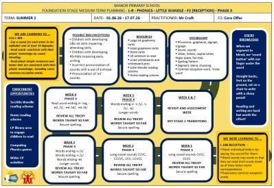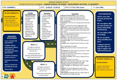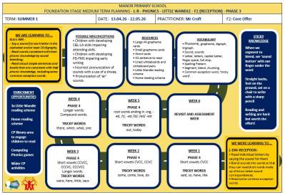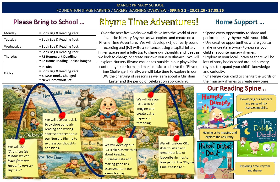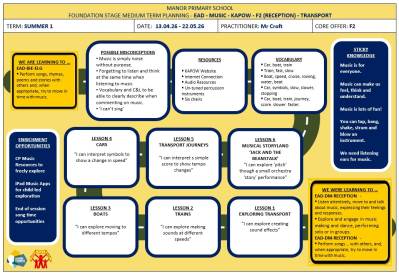 At Manor Primary School we provide the highest standards of teaching and learning by engaging, inspiring, challenging and supporting children to do their best and develop a love of learning. To do this we create a respectful and inclusive atmosphere that is welcoming, fun, friendly and safe through child-led and techer-initiated continuous provision 'learning though play'. The continuous provision universal offer follows a two year cycle and is inspired though a carefully curated book spine, enriched and expanded by the pupils interests.