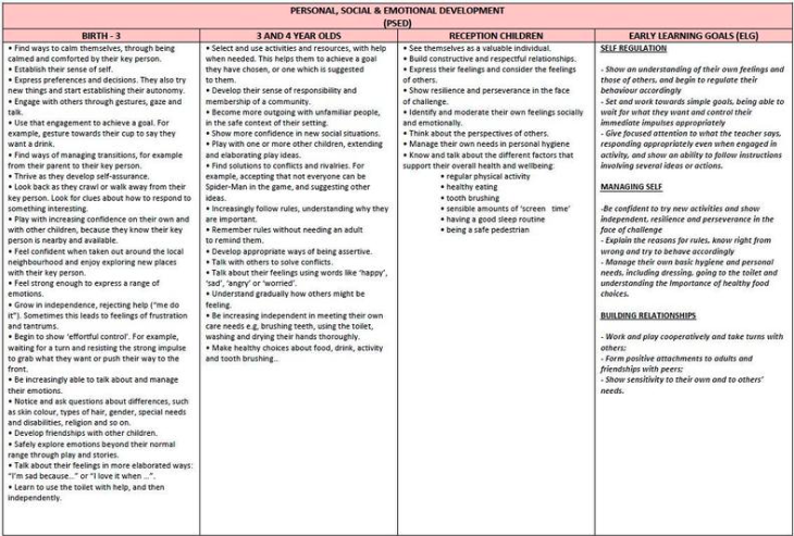 Children’s personal, social and emotional development (PSED) is crucial for children to lead healthy and happy lives, and is fundamental to their cognitive development. Underpinning their personal development are the important attachments that shape their social world. Strong, warm and supportive 9 relationships with adults enable children to learn how to understand their own feelings and those of others. Children should be supported to manage emotions, develop a positive sense of self, set themselves simple goals, have confidence in their own abilities, to persist and wait for what they want and direct attention as necessary. Through adult modelling and guidance, they will learn how to look after their bodies, including healthy eating, and manage personal needs independently. Through supported interaction with other children, they learn how to make good friendships, co-operate and resolve conflicts peaceably. These attributes will provide a secure platform from which children can achieve at school and in later life.
